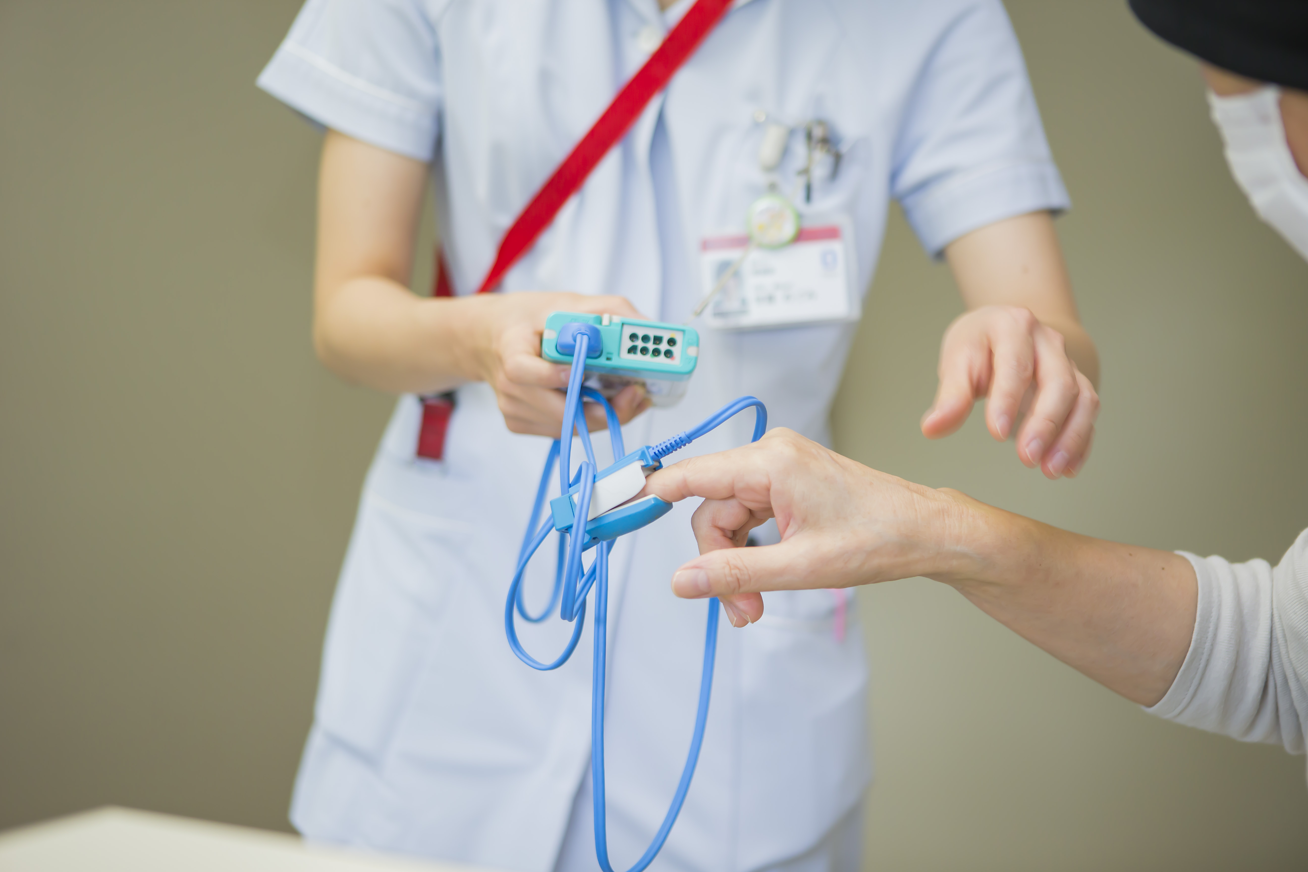 上の写真 呼吸状態を見るために酸素飽和度を測る